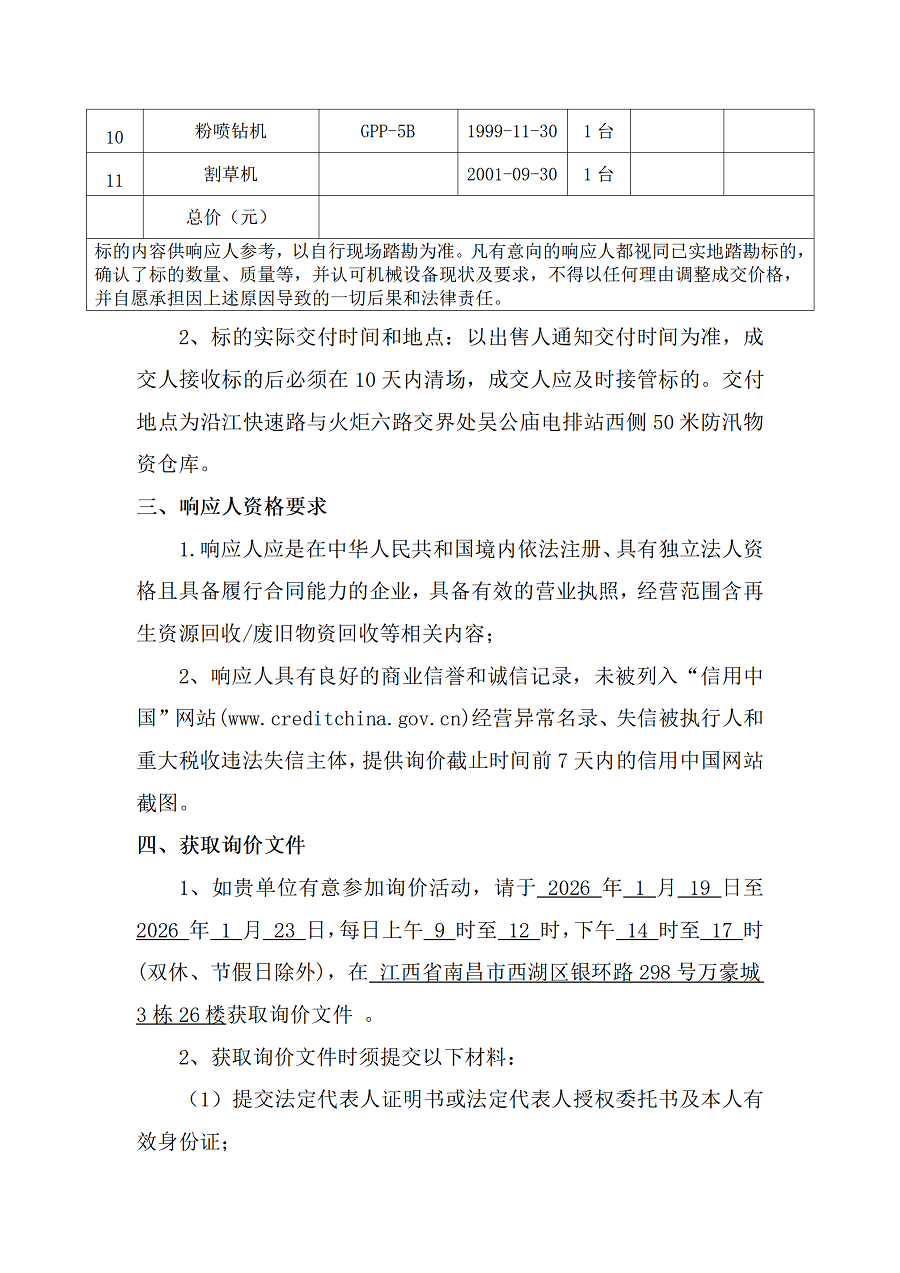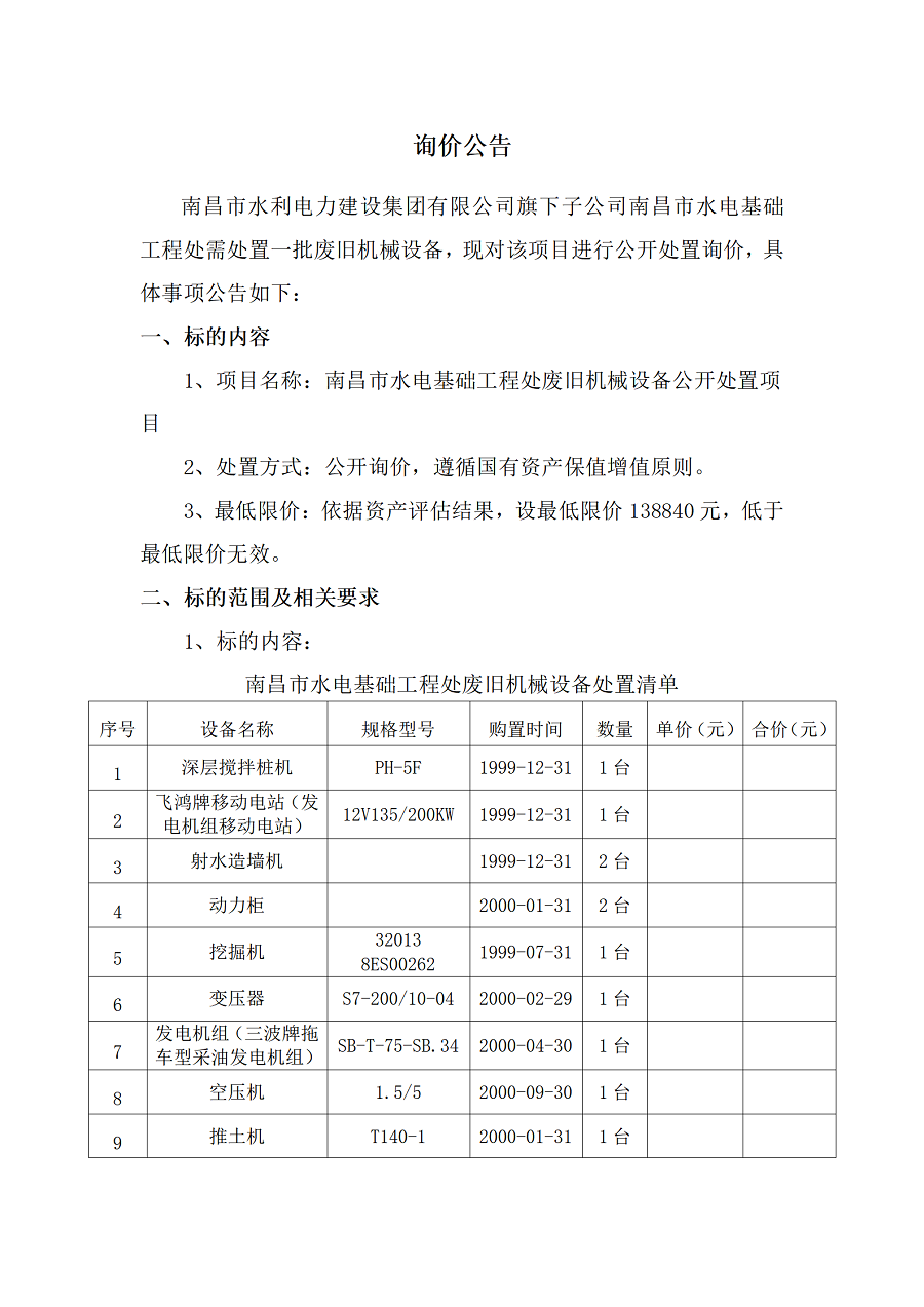 南昌市水電基礎(chǔ)工程處廢舊機(jī)械設(shè)備公開處置項(xiàng)目詢價(jià)公告
