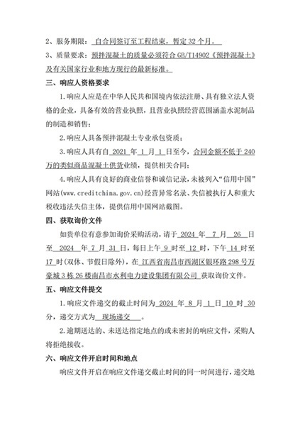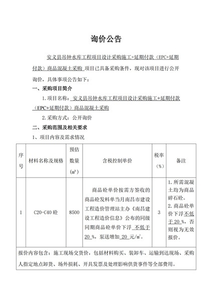 安義縣吊鐘水庫(kù)工程項(xiàng)目設(shè)計(jì)采購(gòu)施工+延期付款(EPC+延期付款)商品混凝土采購(gòu)項(xiàng)目詢價(jià)公告