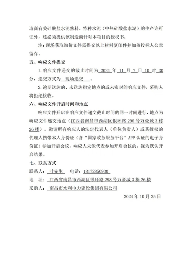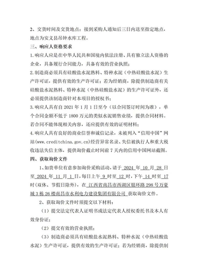 安義縣吊鐘水庫工程項目設計采購施工+延期付款(EPC+延期付款)水泥采購項目詢價公告