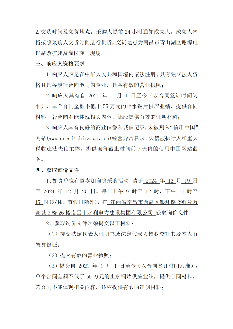 南昌市青山湖區(qū)謝埠電排站改擴(kuò)建及灌區(qū)建設(shè)項(xiàng)目、青山湖區(qū)普慶寺溝清淤項(xiàng)目EPC總承包謝埠電排站止水銅片采購(gòu)項(xiàng)目詢價(jià)公告