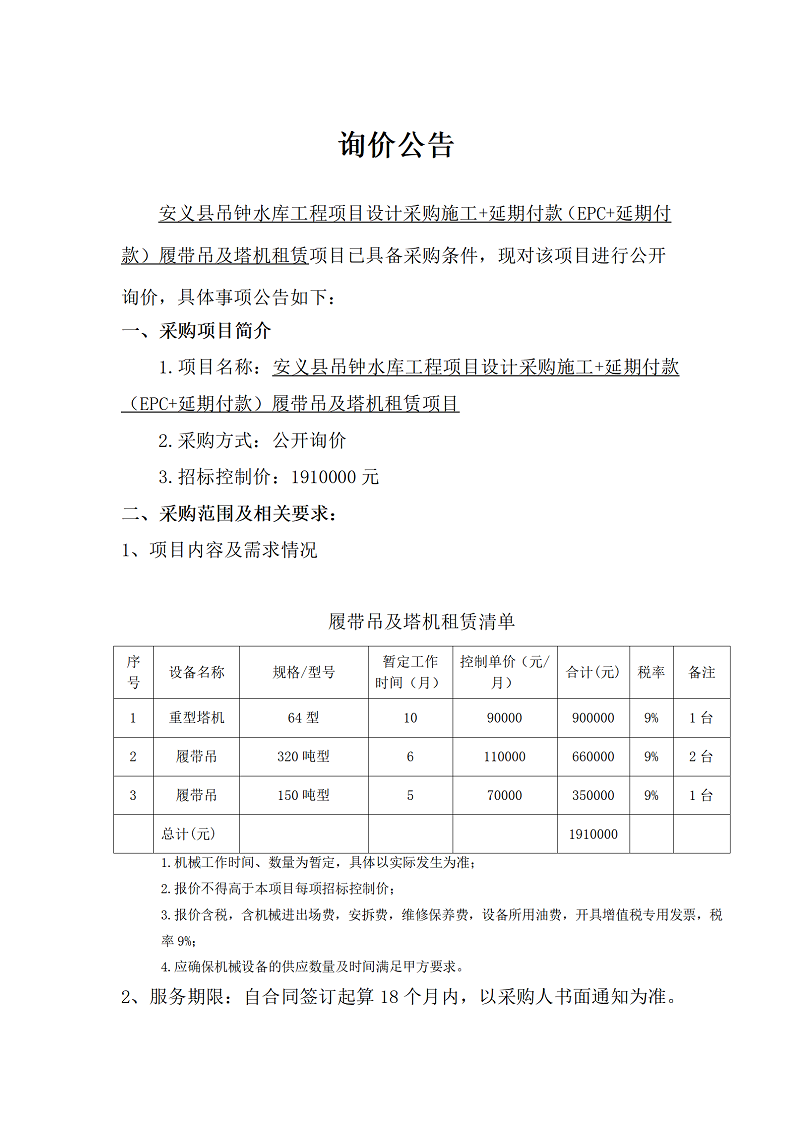 安義縣吊鐘水庫(kù)工程項(xiàng)目設(shè)計(jì)采購(gòu)施工+延期付款(EPC+延期付款)履帶吊及塔機(jī)租賃項(xiàng)目詢價(jià)公告